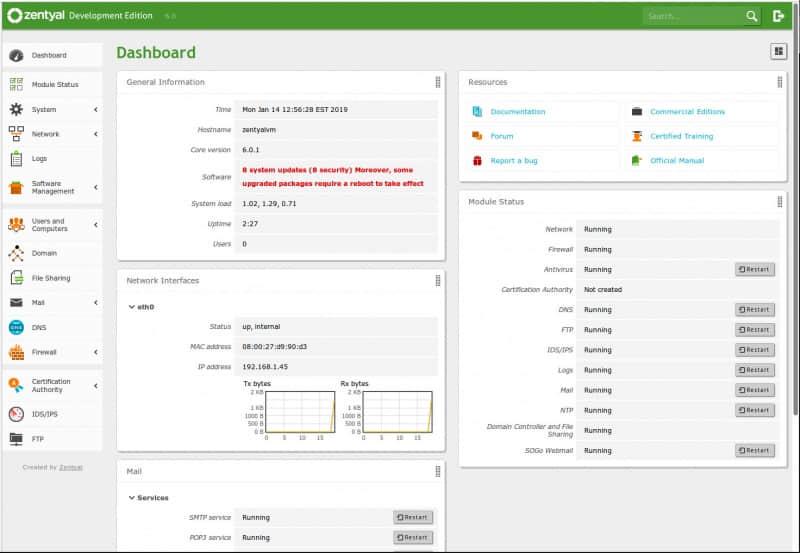 Zentyal 可能是你的新选择。从 2004 年 Zentyal 就存在了,它基于 Ubuntu Server,因此它拥有坚实的基础和丰富的应用程序。在 Zentyal 仪表板的帮助下(图 5),管理员可以轻松管理: