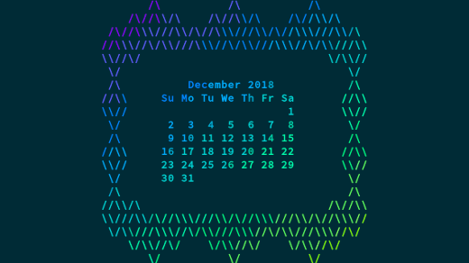 $ cal | boxes -d diamonds -p a1l4t2 /\ /\ /\ /\//\\/\ /\//\\/\ /\//\\/\ /\//\\\///\\/\//\\\///\\/\//\\\///\\/\ //\\\//\/\\///\\\//\/\\///\\\//\/\\///\\ \\//\/ \/\\// \/ \/ /\ December 2018 /\ //\\ Su Mo Tu We Th Fr Sa //\\ \\// 1 \\// \/ 2 3 4 5 6 7 8 \/ /\ 9 10 11 12 13 14 15 /\ //\\ 16 17 18 19 20 21 22 //\\ \\// 23 24 25 26 27 28 29 \\// \/ 30 31 \/ /\ /\ //\\/\ /\//\\ \\///\\/\//\\\///\\/\//\\\///\\/\//\\\// \/\\///\\\//\/\\///\\\//\/\\///\\\//\/ \/\\//\/ \/\\//\/ \/\\//\/ \/ \/ \/