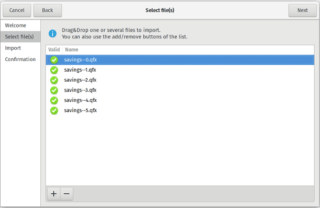 从银行导入文件将使用另一个分步向导进行处理,该向导提供了创建新帐户或填充现有帐户的选项。导入新帐户可节省一点时间,因为你无需在开始导入之前预先创建所有帐户。你还可以一次将多个文件导入帐户,因此不需要对每个帐户中的每个文件重复相同的步骤。