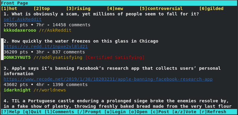 Reddit 终端查看器,或称为 rtv,提供了从终端浏览 Reddit 的界面。它提供了 Reddit 的基本功能,因此你可以登录到你的帐户,查看 subreddits、评论、点赞和发现新主题。但是,rtv 目前不支持 Reddit 标签。