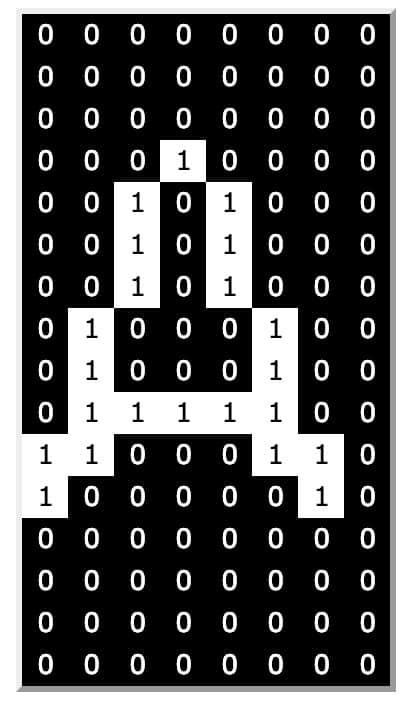 这个示意图展示了等宽、单色、8x16 的字符 A 的 “Bitstream Vera Sans Mono” 字体。在这个文件中,我们可以找到,它从第 41 16 × 10 16 = 410 16 字节开始的十六进制序列: