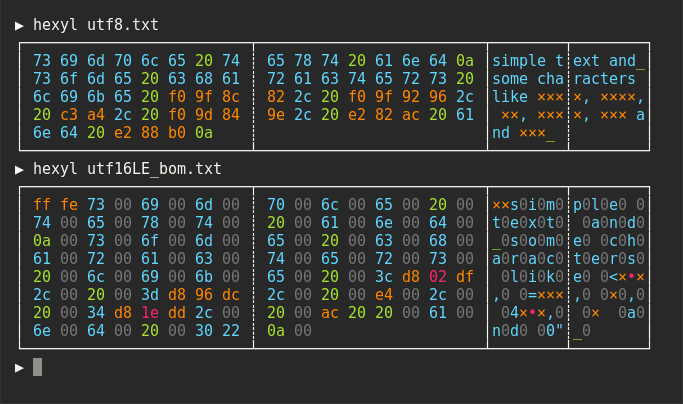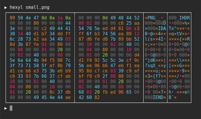 它就是 hexyl,是一个面向终端的简单的十六进制查看器。它使用颜色来区分不同的字节类型(NULL、可打印的 ASCII 字符、ASCII 空白字符、其它 ASCII 字符和非 ASCII 字符)。