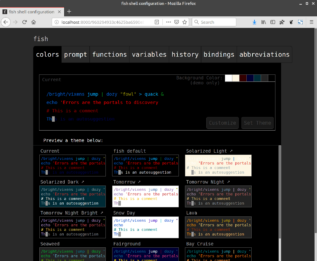 $ fish_config Web config started at 'file:///home/daygeek/.cache/fish/web_config-86ZF5P.html'. Hit enter to stop. qt5ct: using qt5ct plugin ^C Shutting down.