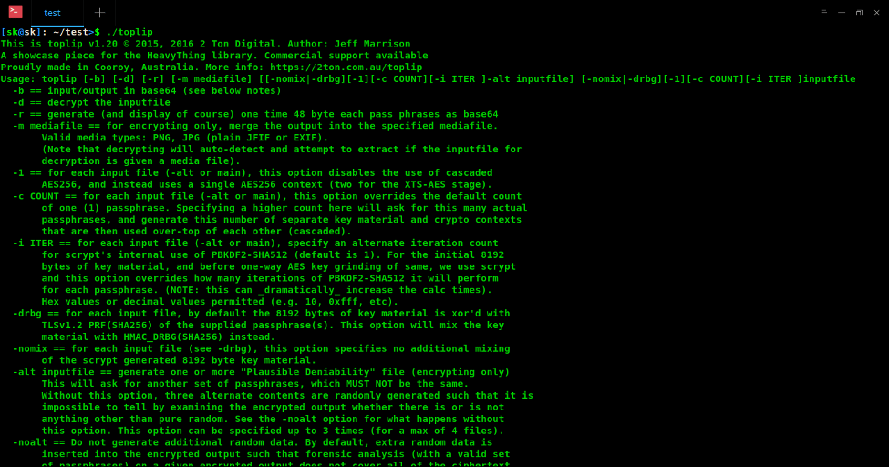 This is toplip v1.20 (C) 2015, 2016 2 Ton Digital. Author: Jeff Marrison A showcase piece for the HeavyThing library. Commercial support available Proudly made in Cooroy, Australia. More info: https://2ton.com.au/toplip file1 Passphrase #1: generating keys...Done file1 Passphrase #2: generating keys...Done Encrypting...Done