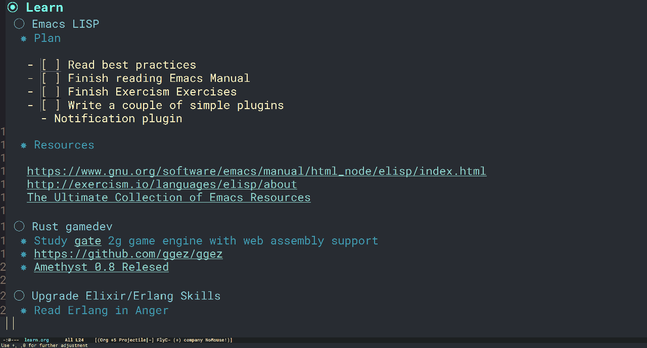 * Learn ** Emacs LISP *** Plan - [ ] Read best practices - [ ] Finish reading Emacs Manual - [ ] Finish Exercism Exercises - [ ] Write a couple of simple plugins - Notification plugin *** Resources https://www.gnu.org/software/emacs/manual/html_node/elisp/index.html http://exercism.io/languages/elisp/about [[http://batsov.com/articles/2011/11/30/the-ultimate-collection-of-emacs-resources/][The Ultimate Collection of Emacs Resources]] ** Rust gamedev *** Study [[https://github.com/SergiusIW/gate][gate]] 2d game engine with web assembly support *** [[ggez][https://github.com/ggez/ggez]] *** [[https://www.amethyst.rs/blog/release-0-8/][Amethyst 0.8 Relesed]] ** Upgrade Elixir/Erlang Skills *** Read Erlang in Anger