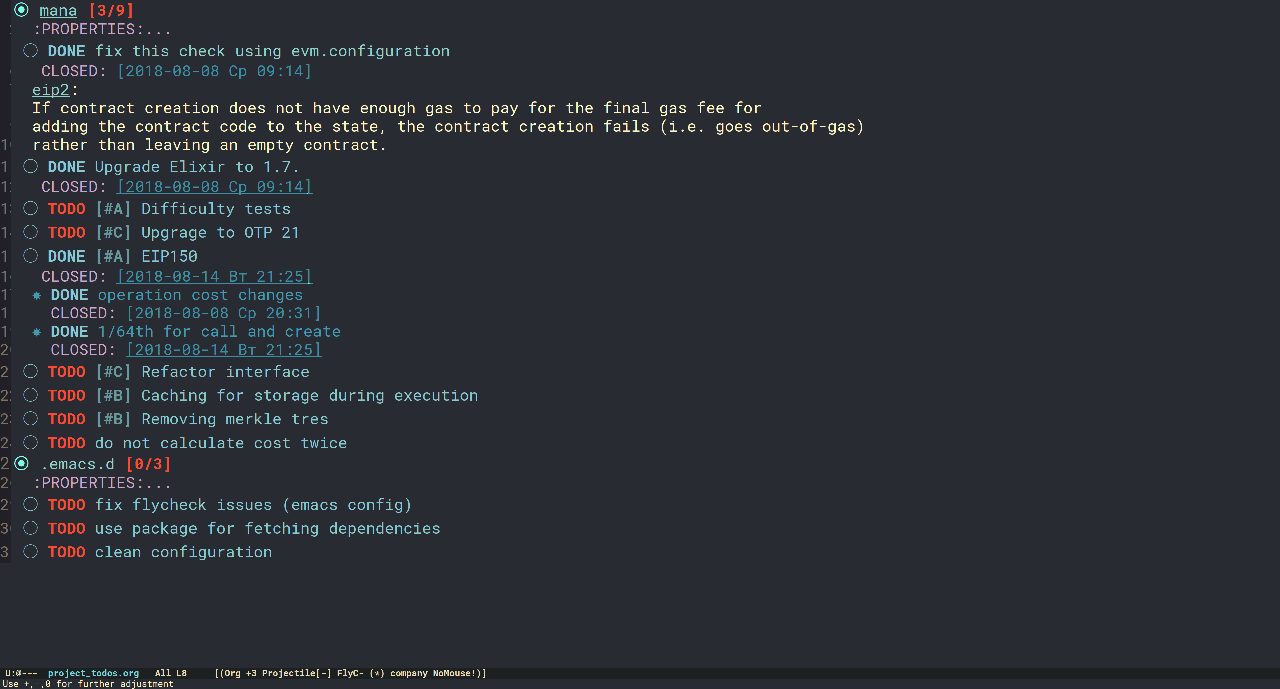 * [[elisp:(org-projectile-open-project%20"mana")][mana]] [3/9] :PROPERTIES: :CATEGORY: mana :END: ** DONE [[file:~/Development/mana/apps/blockchain/lib/blockchain/contract/create_contract.ex::insufficient_gas_before_homestead%20=][fix this check using evm.configuration]] CLOSED: [2018-08-08 Ср 09:14] [[https://github.com/ethereum/EIPs/blob/master/EIPS/eip-2.md][eip2]]: If contract creation does not have enough gas to pay for the final gas fee for adding the contract code to the state, the contract creation fails (i.e. goes out-of-gas) rather than leaving an empty contract. ** DONE Upgrade Elixir to 1.7. CLOSED: [2018-08-08 Ср 09:14] ** TODO [#A] Difficulty tests ** TODO [#C] Upgrage to OTP 21 ** DONE [#A] EIP150 CLOSED: [2018-08-14 Вт 21:25] *** DONE operation cost changes CLOSED: [2018-08-08 Ср 20:31] *** DONE 1/64th for a call and create CLOSED: [2018-08-14 Вт 21:25] ** TODO [#C] Refactor interfaces ** TODO [#B] Caching for storage during execution ** TODO [#B] Removing old merkle trees ** TODO do not calculate cost twice * [[elisp:(org-projectile-open-project%20".emacs.d")][.emacs.d]] [1/3] :PROPERTIES: :CATEGORY: .emacs.d :END: ** TODO fix flycheck issues (emacs config) ** TODO use-package for fetching dependencies ** DONE clean configuration CLOSED: [2018-08-26 Вс 11:48]