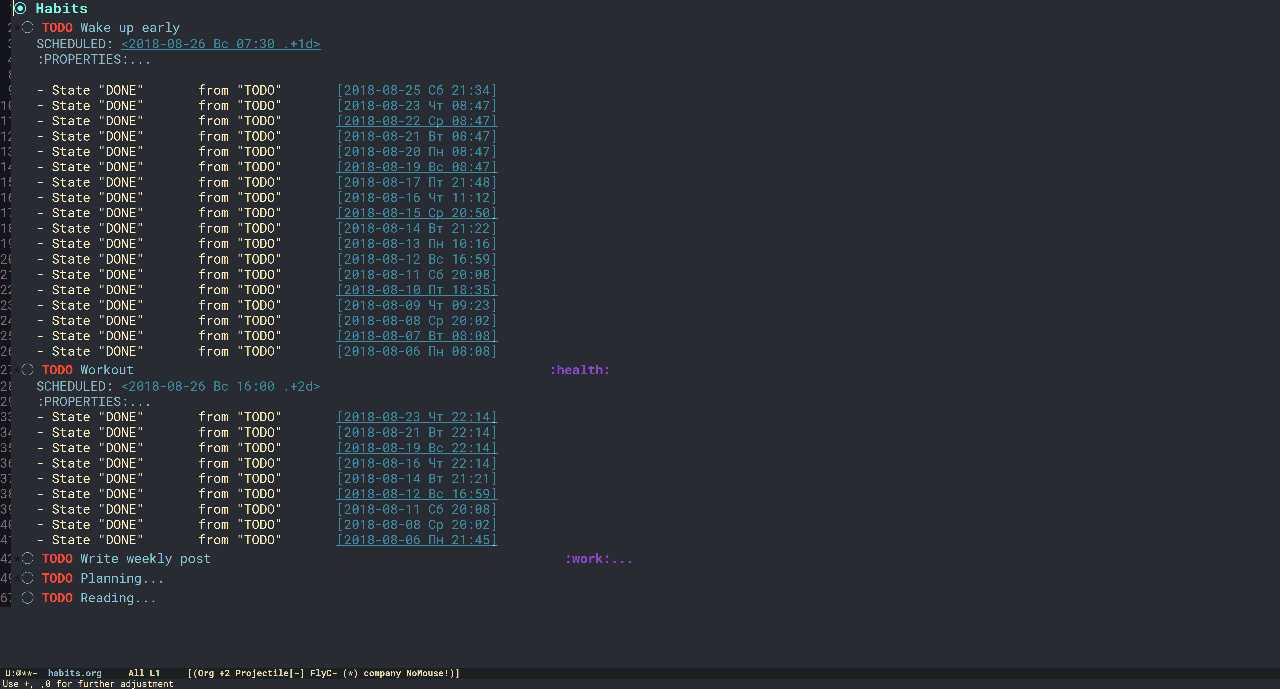根据 Org 模式的文档,Org 能够跟踪一种特殊的代办事情,称为 “习惯”。当我想养成新的习惯时,我会将该功能与日常规划功能一起连用: