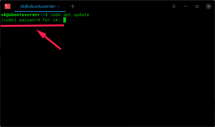 在这种情况下,用户 sk 可以运行 mkdir 和 chmod 命令而不用输入 sudo 密码。然而,当他运行 apt 命令时,就必须提供 sudo 密码了。