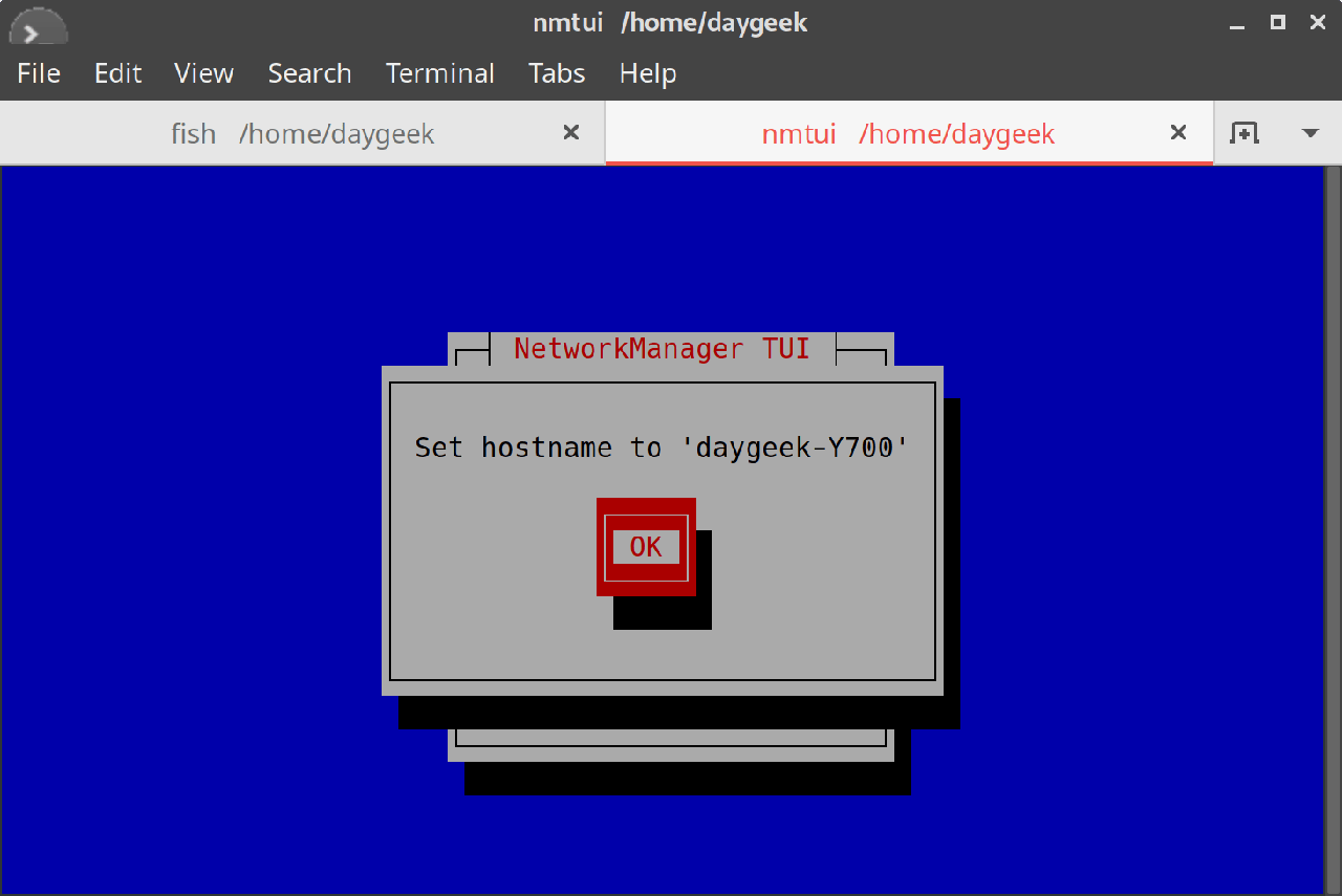然后它将在屏幕中向你展示更新后的主机名,再次选中 “OK” 敲击回车确认就完成更改了。