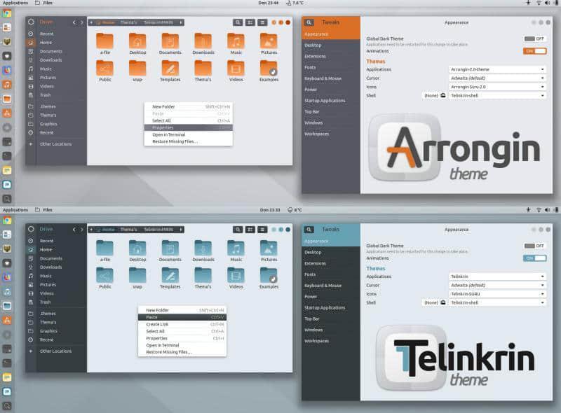 福利:二合一主题!它们是在主题领域中的相对新的竞争者。它们都吸取了 Ubuntu 接近完成的 “communitheme” 的思路,并带它到了你的桌面。这两个主题我能找到的唯一真正的区别就是颜色。Arrongin 以 Ubuntu 家族的橙色颜色为中心,而 Telinkrin 则更偏向于 KDE Breeze 系的蓝色,我个人更喜欢蓝色,但是两者都是极好的选择!