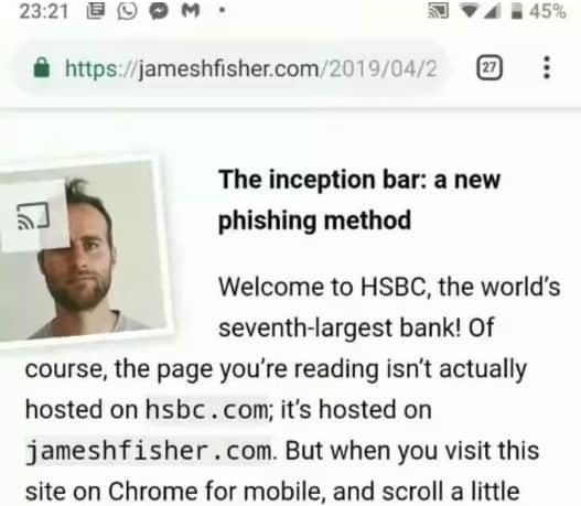 由开发人员 James Fisher 提供,这个相当简单的技巧已在 Chrome 移动版中得到证明,并利用了浏览器在地址栏方面的行为。当用户向下滚动时,为了给网页留出更多空间,Chrome 会隐藏地址栏,而这正是这个所谓的“盗梦空间栏”的用武之地。