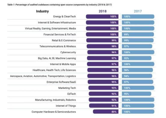 在黑鸭审查的所有代码库中,有 96% 包含了开源组件,而大多数没有开源代码的代码库其实包含不到 1000 个文件。在超过 1000 个文件的代码库中,开源代码的采用率高达 99%。