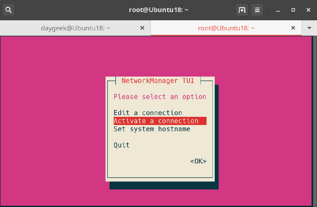 执行以下命令打开 mntui 界面。选择 “Active a connection” 然后点击 “OK”。