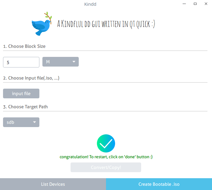 前不久,我们已经学习如何在类 Unix 系统中 使用 dd 命令创建可启动的 ISO。请记住,dd 命令是最具危险性和破坏性的命令之一。如果你不确定你实际在做什么,你可能会在几分钟内意外地擦除你的硬盘数据。dd 命令仅仅从 if 参数获取数据,并写入数据到 of 参数。它将不关心它正在覆盖什么,它也不关心是否在磁道上有一个分区表,或一个启动扇区,或者一个家文件夹,或者任何重要的东西。它将简单地做它被告诉去做的事。如果你是初学者,一般地尝试避免使用 dd 命令来做实验。幸好,这有一个支持 dd 命令的简单的 GUI 实用程序。向 “Kindd” 问好,一个属于 dd 命令的图形化前端。它是自由开源的、用 Qt Quick 所写的工具。总的来说,这个工具对那些对命令行不适应的初学者是非常有用的。