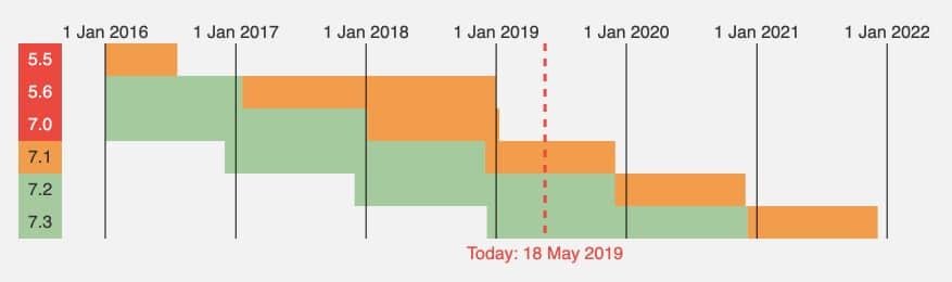 一般来说,每个新版本都会在两年内得到积极支持,并再获得一年以上的“安全修复”。其目标是激励 PHP 开发人员尽可能保持最新:例如,每年进行小规模升级比在 5.4 到 7.0 之间跳转更容易。