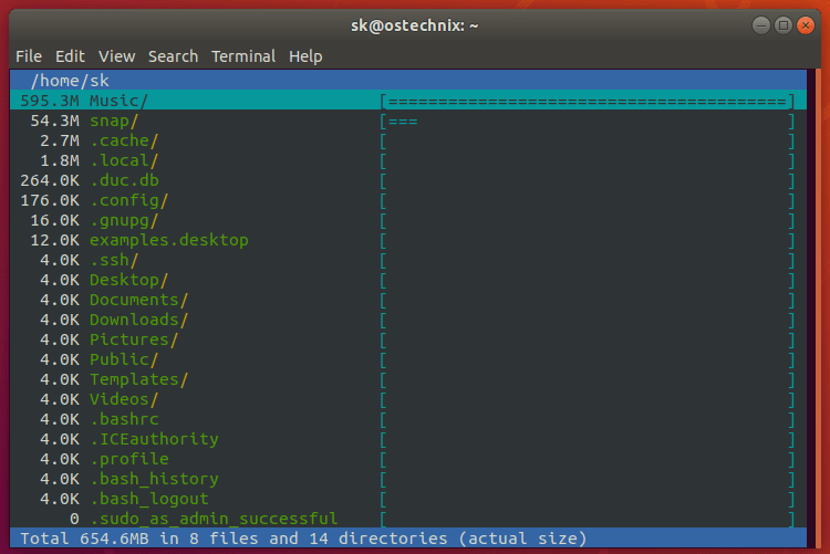 如你在上述输出所见,ls 子命令查询 duc 数据库并列出了所提供目录包含的文件与目录的大小,在这里就是 /home/sk/。
