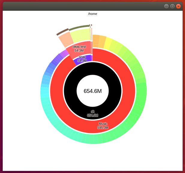 类似的,我们使用 gui * 子命令来查询 duc 数据库以及打开一个图形界面(X11)来了解指定路径的硬盘使用情况。