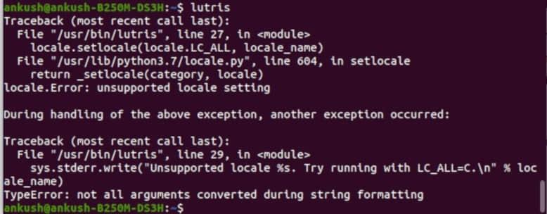 当我尝试时,我遇到了一个问题(当我用 GUI 启动时却没有遇到)。当我尝试在命令行输入 lutris 来启动时,我发现了下图所示的错误:
