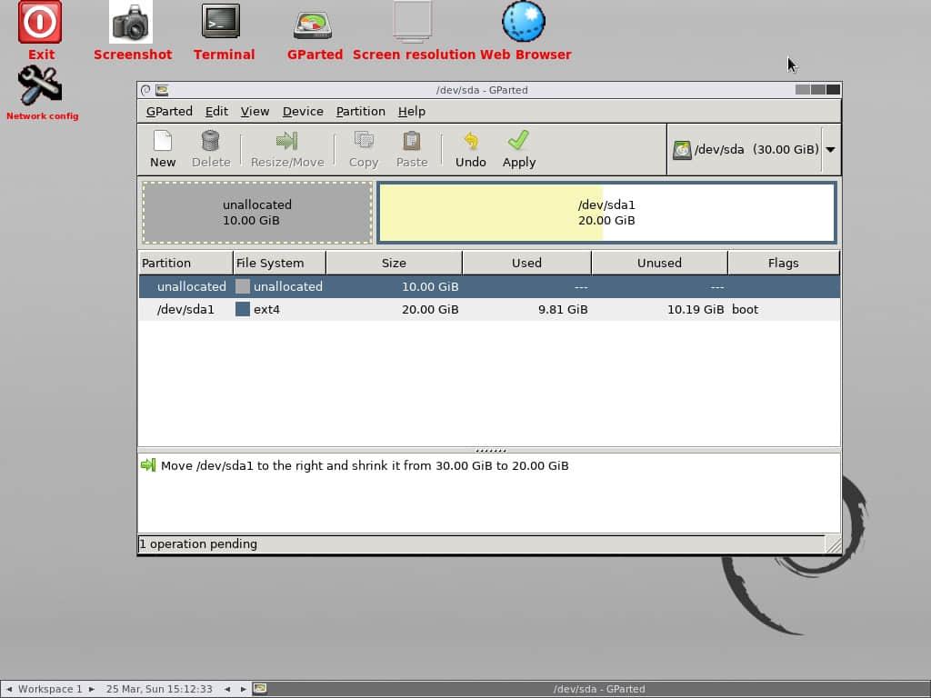 分区从 30GB 缩小到 20GB 已经成功。也显示 10GB 未分配的磁盘空间。