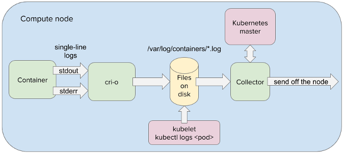 这样的旅程始于 OKD,因为该容器平台完全覆盖了它抽象的硬件。这意味着日志消息等待由驻留在容器中的应用程序写入 stdout 或 stderr 流。从那里,日志消息被容器引擎(例如 CRI-O)重定向到节点的文件系统。