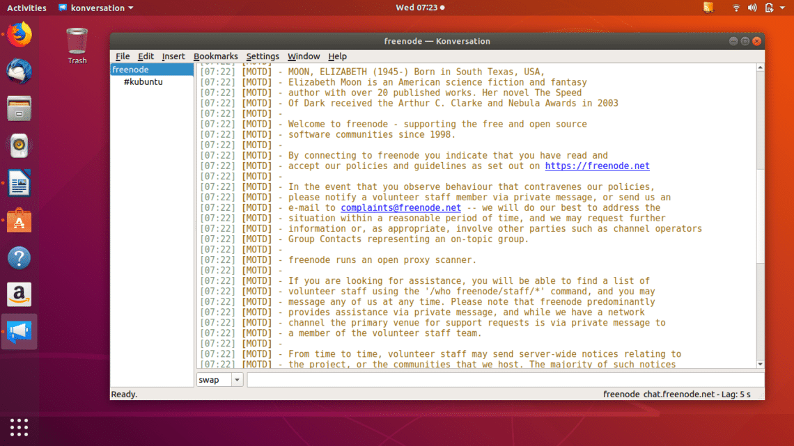 Konversation 是一个为 KDE 桌面环境开发的开源的网络中继聊天(IRC)客户端。它给了你到 Freenode 网络频道的快速入口,你可以为大多数发行版找到支持。