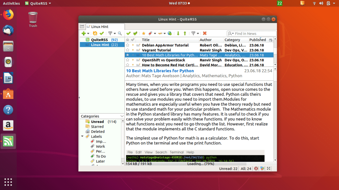 QuiteRSS 自带了很多功能,像内容过滤、自动规划摘要、导入/导出 OPML、系统托盘集成了很多其它摘要阅读器有的特点。
