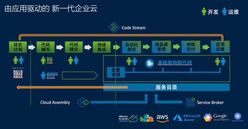 这个基础架构的概念包括 IaaS、PaaS 等,包括各种各样的服务。通过在企业内部实现企业云 2.0,知道企业内部有哪些资源可供被调用,然后把来自不同云的、包括私有云的这些服务组装成企业所需要的基础架构的元配件,再用代码的方式编写成应用所需要的基础架构描述,然后,研发团队会自动的调用这些代码生成基础架构。一个真正的应用,比如 VMware公司 内部在做的云管产品的应用,每天会做几十次的持续集成、自动化测试和持续交付,整个的迭代速度非常快,发现错误的速度也非常快,整个开发的进度就是之前十几倍、几十倍的提升。