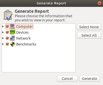 HardInfo 可以收集有关系统硬件和操作系统的信息,执行基准测试,并以 HTML 或纯文本格式生成可打印的报告。