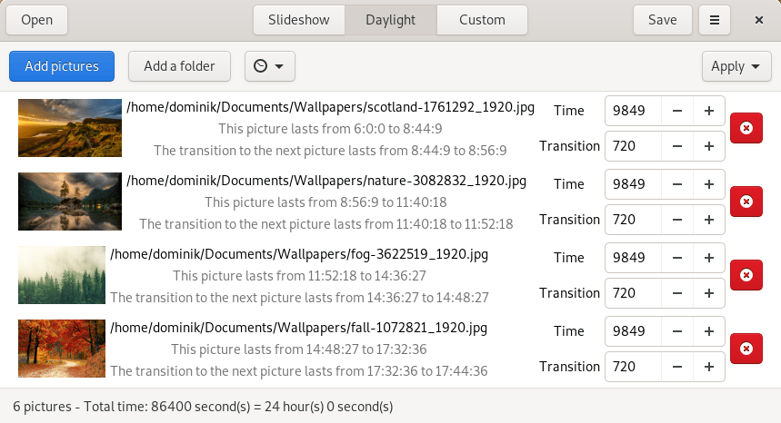 动态墙纸编辑器 是一个可在 GNOME 中创建和编辑随时间变化的壁纸集合的工具。这可以使用 XML 文件来完成,但是,动态墙纸编辑器通过其图形界面使其变得简单,你可以在其中简单地添加图片、排列图片并设置每张图片的持续时间以及它们之间的过渡。