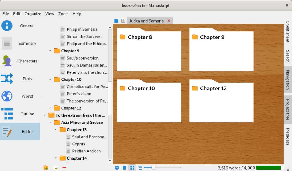 Manuskript 是一个给作者的工具,旨在让创建大型写作项目更容易。它既可以作为编写文本的编辑器,也可以作为组织故事本身、故事人物和单个情节的注释的工具。