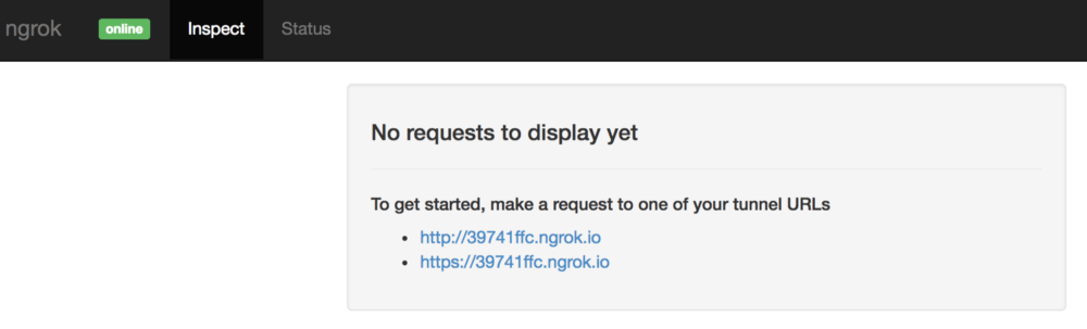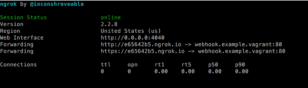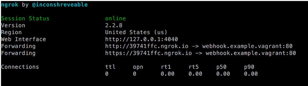 我们刚刚做了什么?基本上,我们指示 ngrok 在端口 80 建立了一个到 http://webhook.example.vagrant 的隧道。同一个 URL 也可以通过 http://39741ffc.ngrok.iohttps://39741ffc.ngrok.io 访问,它们能被任何知道此 URL 的人通过互联网公开访问。