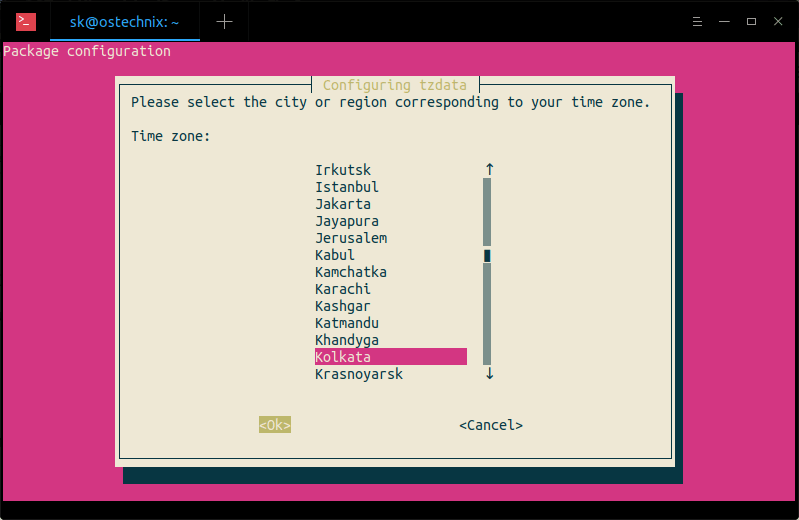 接下来,选择与你的时区对应的城市或地区。这里,我选择了 Kolkata(LCTT 译注:中国用户请相应使用 Shanghai 等城市)。