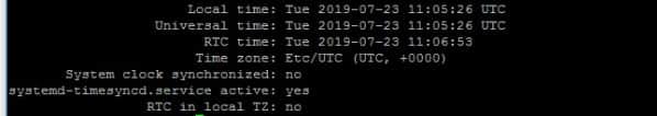 Local time: Tue 2019-07-30 11:53:58 UTC Universal time: Tue 2019-07-30 11:53:58 UTC RTC time: Tue 2019-07-30 11:53:59 Time zone: Etc/UTC (UTC, +0000) System clock synchronized: yes systemd-timesyncd.service active: yes RTC in local TZ: no