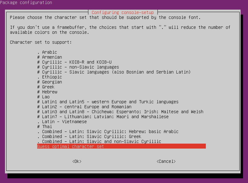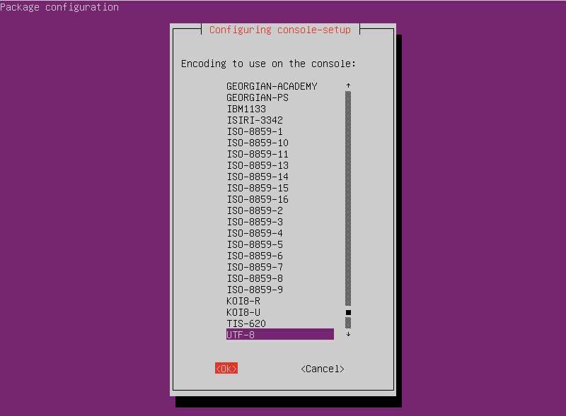 选择要在 Linux 控制台上使用的编码。只需保留默认值,选择 “OK” 并按回车继续。