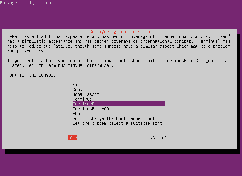 接下来选择控制台的字体,然后按回车键。我这里选择 “TerminusBold”。