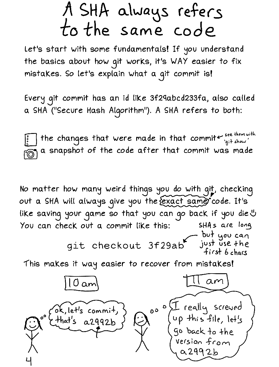 执行这些练习时要记住的最重要的一点是,如本页面所述,像9e3d9a2a009d2a0281802a84e1c5cc1c887edc71 这样的 Git SHA 始终引用同一个的代码。下图摘自我与凯蒂·西勒·米勒撰写的一本杂志,名为《Oh shit, git!》。(她还有一个名为 https://ohshitgit.com/ 的很棒的网站,启发了该杂志。)