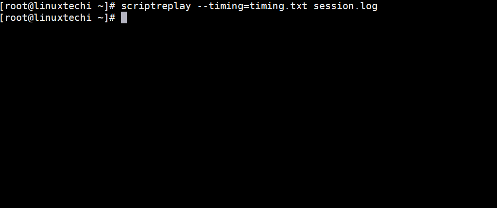 [root@linuxtechi ~]# scriptreplay --timing=timing.txt session.log