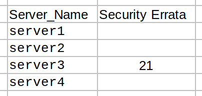 # cat /tmp/sec-up.txt +---------------+-------------------+ | Server_Name | Security Errata | +---------------+-------------------+ server1 server2 server3 21 server4 +-----------------------------------+