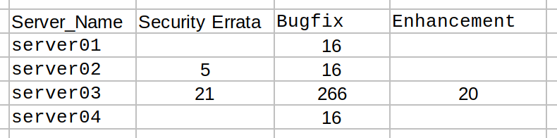 # cat /tmp/sec-up.txt +---------------+-------------------+--------+---------------------+ | Server_Name | Security Errata | Bugfix | Enhancement | +---------------+-------------------+--------+---------------------+ server01 16 server02 5 16 server03 21 266 20 server04 16 +------------------------------------------------------------------+