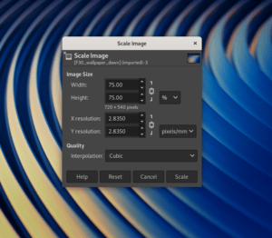 让我们假使我们需要缩小 Fedora 30 背景图像到它当前大小的 75%。为此,选择“ 图像 -> 比例 ”,然后在比例对话框上,在单位下拉列表中选择“ 百分比 ”。接下来,输入 “75” 作为宽度或高度,然后按 Tab 键。默认情况下,其它尺寸将自动地调整大小,以相应地与更改的尺寸保持纵横比。现在,保存其它选项不变,并按比例。
