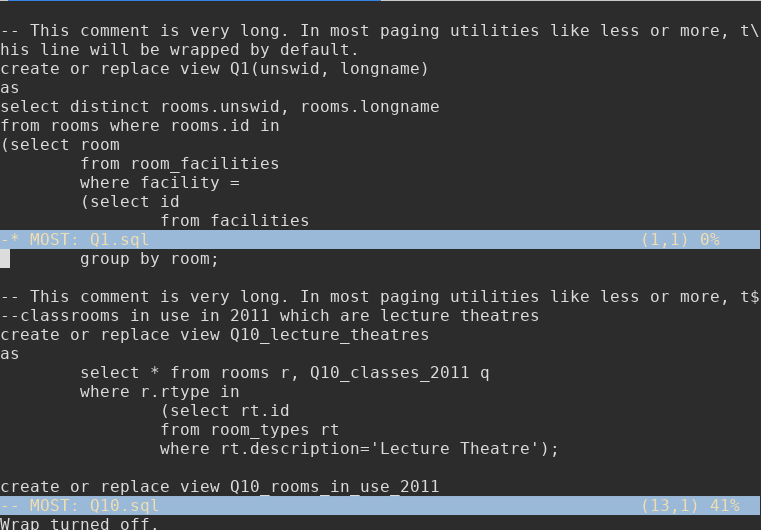 重要的是,most 考虑了其输入文本的宽度。默认的查看模式是不换行的(less 中的 -S 参数),此功能在处理“宽”文件时特别有用。尽管对于某些用户来说,这些设计决策可能代表着与传统的重大偏离,但最终结果却非常强大。