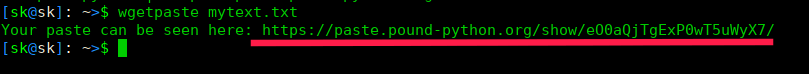 $ wgetpaste -r mytext.txt Your raw paste can be seen here: https://paste.pound-python.org/raw/CUJhQ3jEmr2UvfmD2xCL/
