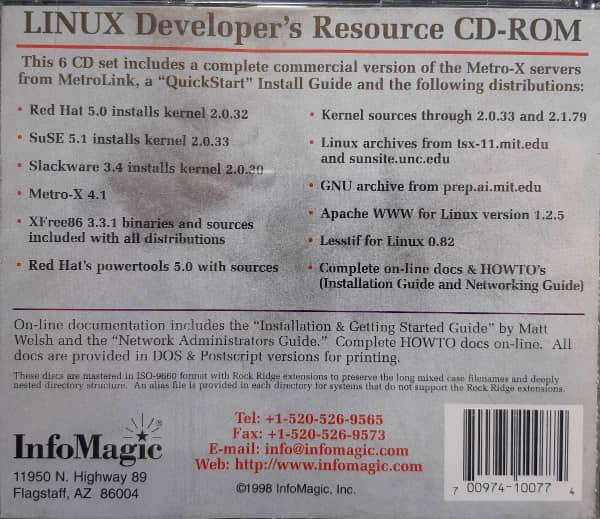 我走了一条简单一点的路:在 1996 年,我从一家主要的 Linux 发行商订购了一套 “tri-Linux” CD 集。这些光盘提供了三个发行版,我的这套包含了 Debian 1.1(Debian 的第一个稳定版本)、Red Hat Linux 3.0.3 以及 Slackware 3.1(代号 Slackware ‘96)。据我回忆,这些光盘是从一家叫做 Linux Systems Labs 的在线商店购买的。这家在线商店如今已经不存在了,但在 90 年代和 00 年代早期,这样的发行商很常见。这些是多光盘 Linux 套件。这是 1998 年的一套光盘,你可以了解到他们都包含了什么: