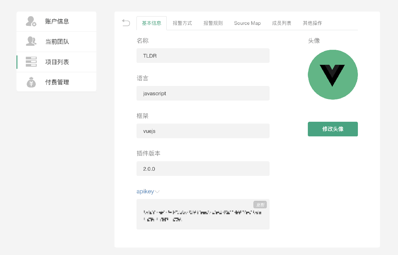 Fundebug 的安装也很简单, 访问 https://www.fundebug.com/ ,注册账号, 并创建一个项目,你会获得一个 API Key,后续你可以使用这个 API Key 来初始化你的项目。