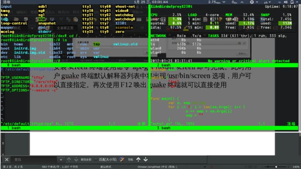 此时用户 guake 终端默认解释器列表中将出现 /usr/bin/screen 选项,用户可以直接指定。再次使用 F12 唤出 guake 终端就可以直接使用 screen 快捷键进行分屏操作了。