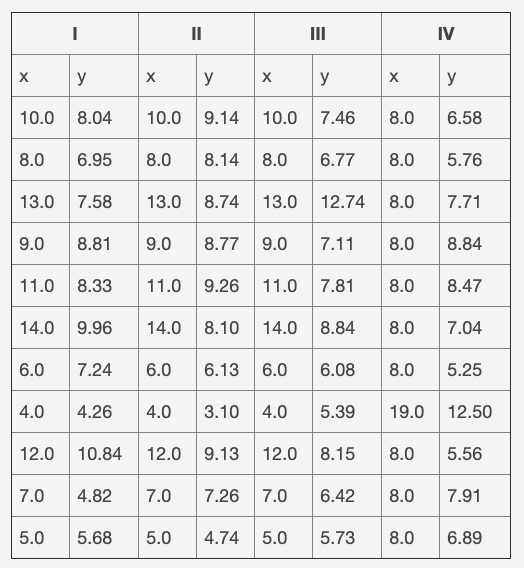 这是许多数据科学家遇到的普遍情况。示例数据是 Anscombe 的四重奏的第一组,如下表所示。这是一组人工构建的数据,当拟合直线时可以提供相同的结果,但是它们的曲线非常不同。数据文件是一个文本文件,其中的制表符用作列分隔符,前几行作为标题。该任务将仅使用第一组(即前两列)。