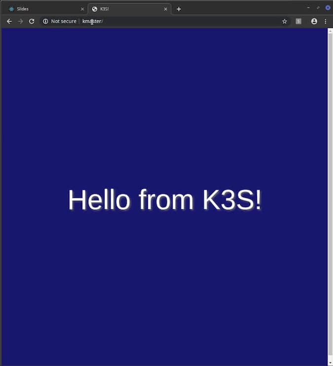 <html> <head><title>K3S!</title> <style> html { font-size: 62.5%; } body { font-family: sans-serif; background-color: midnightblue; color: white; display: flex; flex-direction: column; justify-content: center; height: 100vh; } div { text-align: center; font-size: 8rem; text-shadow: 3px 3px 4px dimgrey; } </style> </head> <body> <div>Hello from K3S!</div> </body> </html>