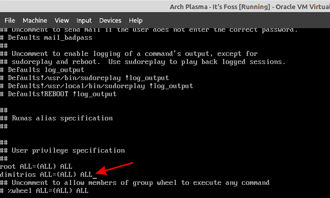 保存你的更改,然后退出编辑器。你现在在 Arch Linux 上有了一个 sudo 用户。