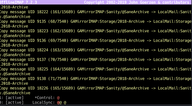 - 我每天用 OfflineIMAP 把工作邮件同步到笔记本,以便用 Mutt 看邮件。它是很特别的工具,只做一件事:保证本地的邮件副本与远程的收件箱完全同步。配置和用 cron 调度它都相当简单,然后你就可以忘了它的存在。它相当简单,你与 IMAP 打交道的每一刻时间都应该用它。