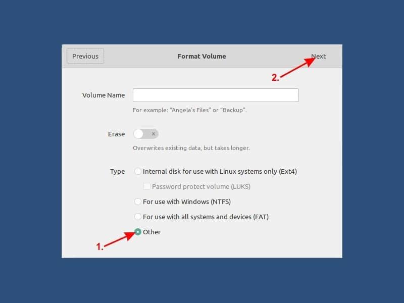 诸如 Ext4、NTFS、FAT 之类的常用文件系统将首先出现。要使用 exFAT,请选择 “其它”,然后单击 “下一步”。